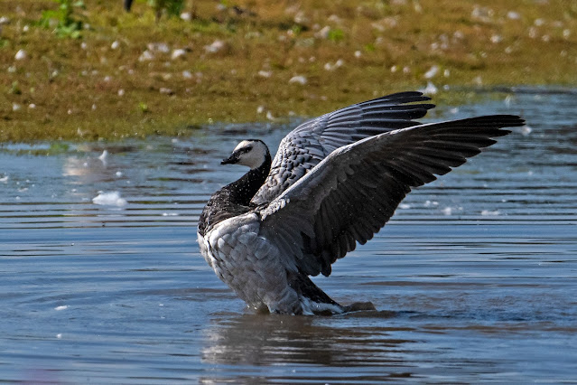 There are two walks from the Visitor Centre – one to a small open hide overlooking the same ponds as the Centre and the other to a large pathway that led to another viewing centre with windows on three sides again overlooking ponds and scrapes with a large variety of wetland birds. Both of these walks are totally paved with green cover on both the sides, mostly sedges and rushes with very little flowering. It was a very sunny day and the activity at the water bodies was better than at the periphery. We settled at different hides that were strategically placed along the water bodies, mostly waders, geese and ducks were seen dabbling and moving around from one island to the other. We had sighted a lifer here as well, the Barnacle Goose.